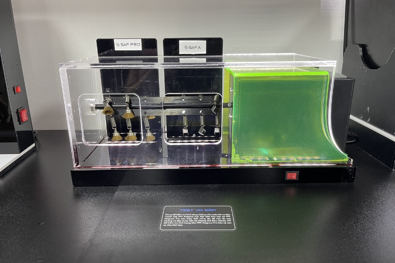 Máy có thể điều chỉnh tốc độ và lực va đập từ nhẹ đến mạnh, mô phỏng các điều kiện thực tế khi xe chạy trên đường. Sau khi hoàn tất, tắt máy và quan sát bề mặt phim để kiểm tra mức độ trầy xước hoặc biến dạng. Ngoài ra, kỹ thuật viên có thể dùng máy sấy nhiệt để tiếp tục kiểm tra khả năng tự phục hồi của phim PPF sau khi bị tác động — qua đó đánh giá chính xác độ bền và chất lượng của vật liệu.